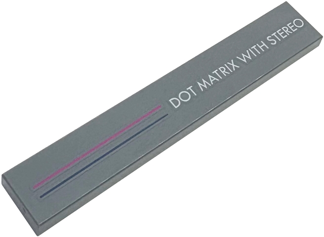 Tile 1 x 6 with Magenta and Dark Blue Stripes and White 'DOT MATRIX WITH STEREO' Pattern
