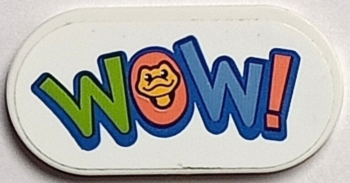 Tile, Round 2 x 4 Oval with Lime, Dark Azure, Coral and Blue 'WOW!' and Bright Light Orange Gecko Head (Popcorn) Pattern (Sticker) - Set 41739