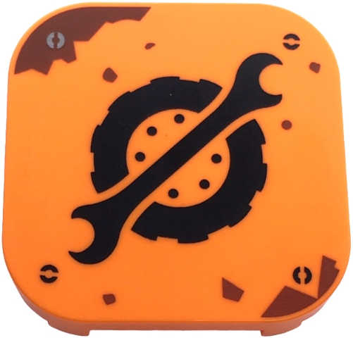 Tile, Modified 4 x 4 with Rounded Corners and 4 Feet with Black Spanner Wrench and Wheel with Tire Logo, Reddish Brown Rust Stains, Screw Heads Pattern