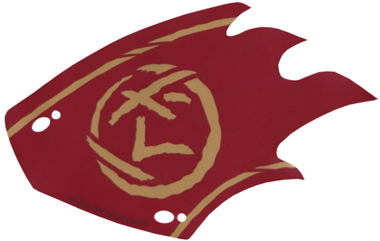 Plastic Part for Set 71843 - Pauldron for Mech, Gold Stripes and Ninjago Logogram 'RJ' in Circle on Red Background Pattern