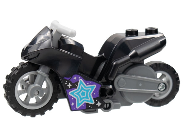 Stuntz Flywheel Motorcycle Sport Bike Tapered Front with Dark Bluish Gray Frame, Light Bluish Gray Wheels, and Light Bluish Gray Handlebars with Medium Azure, Dark Pink, and Silver Stars Pattern