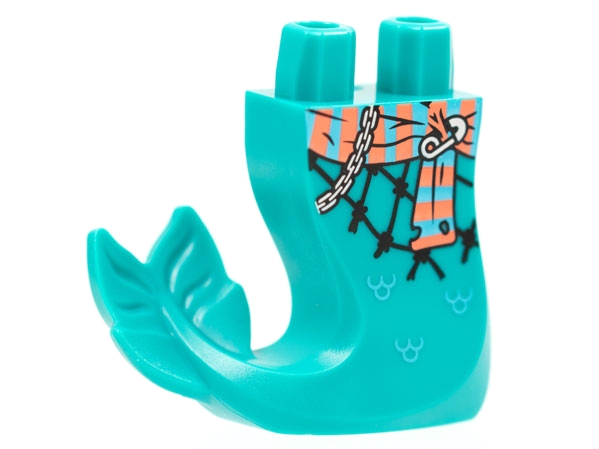 Tail, Mermaid / Merman Curved Right with Medium Azure and Coral Sash, Silver Chain and Pin, Black Fishnet Pattern