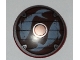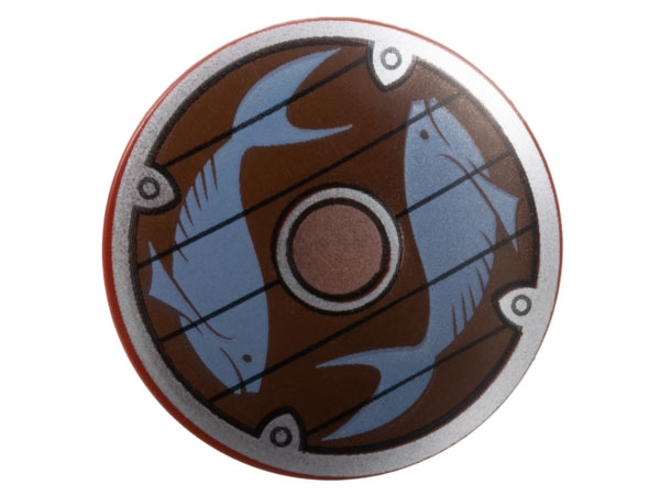Minifigure, Shield Circular / Round Convex Face with Silver Border, Copper Center, and Sand Blue Fish on Dark Brown Wood Background Pattern