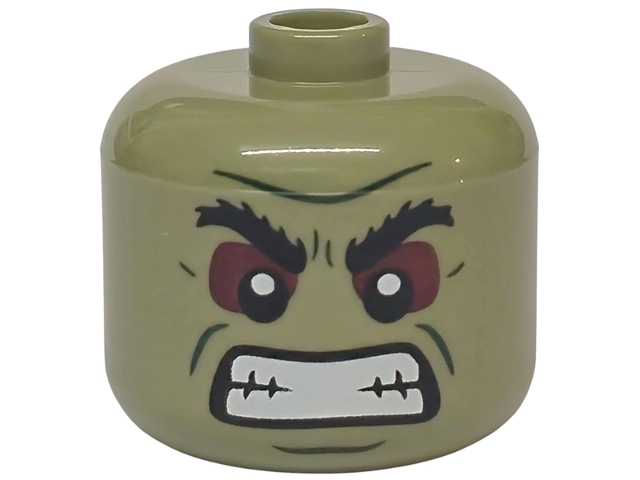 Minifigure, Head, Modified Giant Black Bushy Eyebrows, Dark Green Cheek Lines, Chin Dimple, and Furrowed Brow, Dark Red Eye Shadow, Open Mouth with Clenched Teeth Pattern