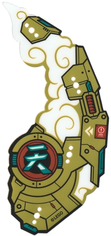 Plastic Part for Set 80045 - Gold Mechanical Panel with Red Circle and Vent, White Clouds, and Dark Turquoise Chinese Logogram, LEGO Copyright on Bottom Right Pattern