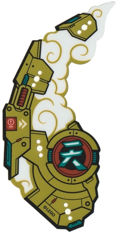 Plastic Part for Set 80045 - Gold Mechanical Panel with Red Circle and Vent, White Clouds, and Dark Turquoise Chinese Logogram, LEGO Copyright on Bottom Left Pattern