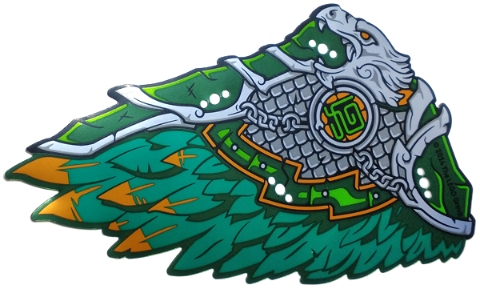 Plastic Part for Set 80056 - Dragon Wing Left with Silver and Dark Green Head, Chains, and Armor, Dark Turquoise and Orange Feathers Pattern