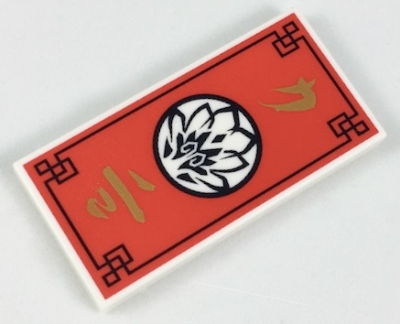 Tile 2 x 4 with Red Asian Tapestry with Black Border and Flower Symbol in White Circle Pattern