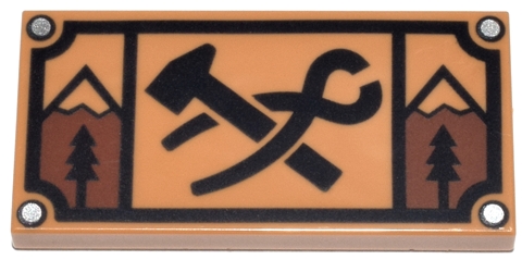 Tile 2 x 4 with Black Blacksmith's Hammer and Tongs, Trees and Mountains Pattern