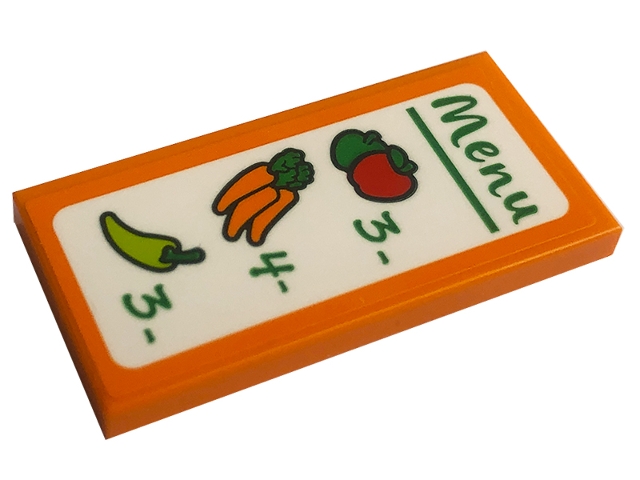 Tile 2 x 4 with Green 'Menu' with Apples, Carrots, Chili Pepper, Number 3, 4 and 3 Pattern (Sticker) - Set 60345