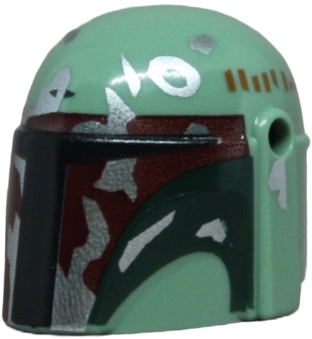 Minifigure, Headgear Helmet with Holes, SW Mandalorian with Black and Dark Red Visor, Dark Green Cheek Indents and Silver Battle Damage Pattern