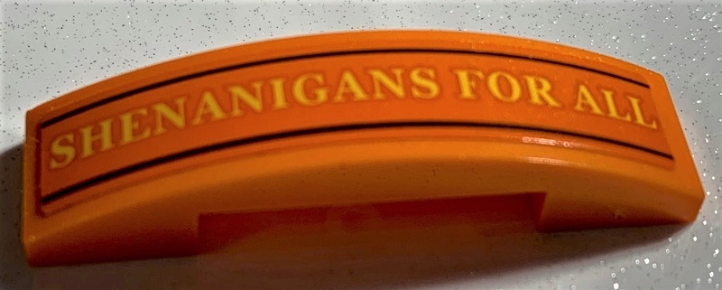 Slope, Curved 4 x 1 x 2/3 Double with Yellow 'SHENANIGANS FOR ALL' and Black Lines Pattern (Sticker) - Set 75978