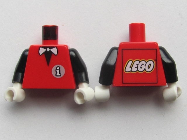Torso Vest with White Lowercase Letter i on Light Gray Circle Infomaniac Logo over Black Shirt, Bow Tie, LEGO Logo on Back Pattern / Black Arms / White Hands