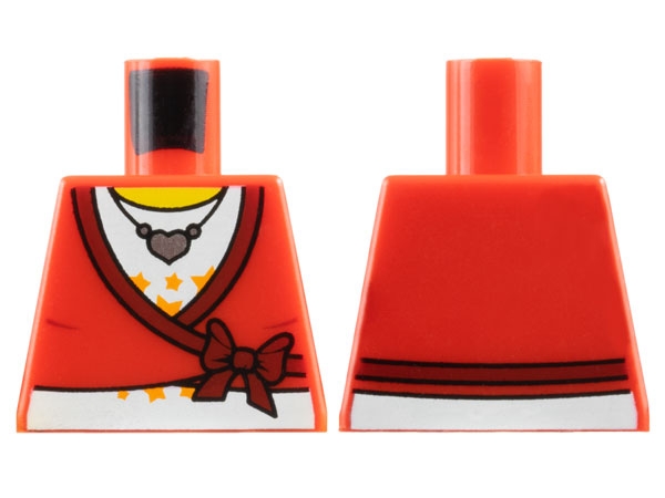 Torso Sweater Cropped with Dark Red Bow and Trim over White Shirt with Bright Light Orange Stars, Silver Heart Pendant Necklace, Yellow Neck Pattern