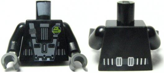 Torso Space Light Bluish Gray Harness, Dark Bluish Gray Belt, Silver Buckles, Pin with Stylized Lime Capital Letter B (Blacktron II Logo) Pattern / Black Arms / Dark Bluish Gray Hands