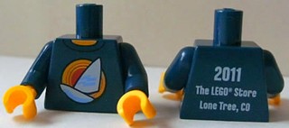 Torso Shirt with White Sailboat over Red Concentric Circles Sun, Yellow Neck, '2011 The LEGO Store Lone Tree, CO' on Back Pattern / Dark Blue Arms / Yellow Hands