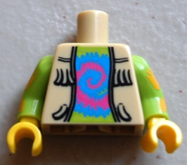 Torso Vest Open with Fringe over Lime Shirt with Dark Pink and Medium Blue Tie-Dyed Swirl Pattern / Lime Arms with Bright Light Orange Tie-Dyed Stripes Pattern / Yellow Hands