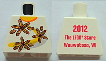 Torso Shirt with Orange Collar and 3 Flowers over Yellow and Silver Curved Stripes, '2012 The LEGO Store Wauwatosa, WI' on Back Pattern