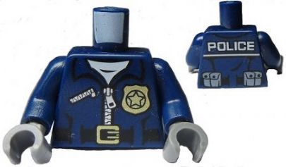 Torso Police Jacket with White Undershirt, Zippers, Gold Badge and Buckle with 'POLICE' Pattern on Back / Dark Blue Arms / Dark Bluish Gray Hands