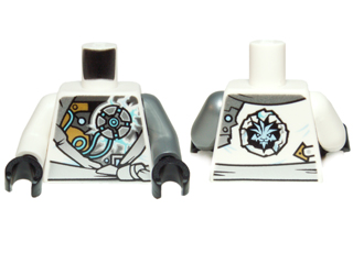 Torso Ninjago Robe with Exposed Mechanical Parts and Ice Power Emblem Pattern / Flat Silver Arm Left / White Arm Right / Black Hands