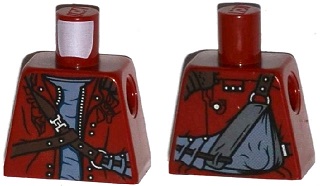 Torso Open Zipper Jacket over Gray Shirt with Silver Rivets and Leather Straps, Sling Bag on Back Pattern