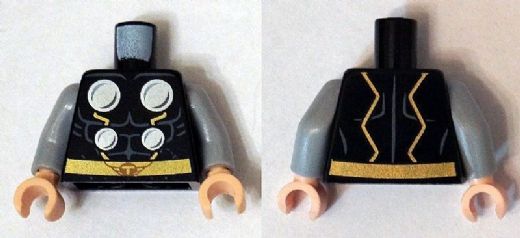 Torso Super Hero Costume with 4 Silver Circles and Gold Belt with Capital Letter T, Dark Bluish Gray Muscles Outline Pattern / Light Bluish Gray Arms / Light Nougat Hands