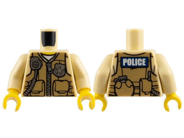 Torso Police Shirt with Dark Tan Vest with Pockets, Silver Radio and Badge, Zipper and 'POLICE' Pattern on Back / Tan Arms / Yellow Hands