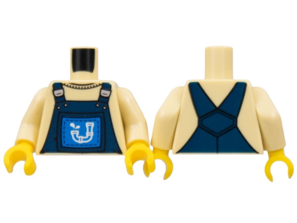 Torso Overalls Dark Blue over Crew Neck Shirt, White Drainpipe on Blue Patch Pattern / Tan Arms / Yellow Hands