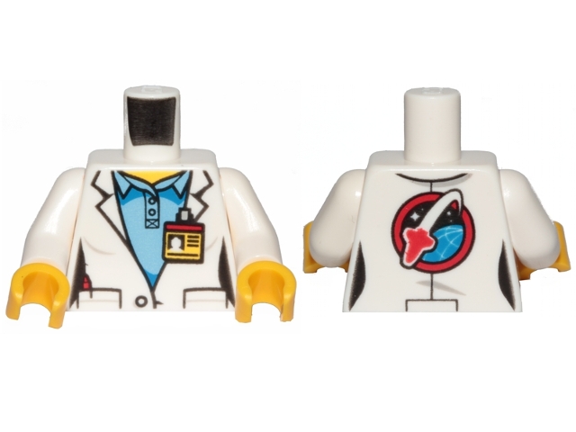 Torso Female Lab Coat over Medium Blue Shirt, ID Badge on Front, Space Shuttle Logo on Back Pattern / White Arms / Yellow Hands
