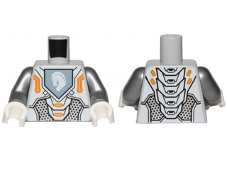 Torso Nexo Knights Armor with Orange and Gold Circuitry and White Horse Head on Sand Blue Pentagonal Shield Pattern / Flat Silver Arms / White Hands