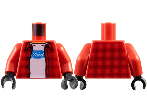 Torso Plaid Flannel Shirt Open over White T-Shirt with Ford Logo, Yellow Neck Pattern / Red Arms / Black Hands
