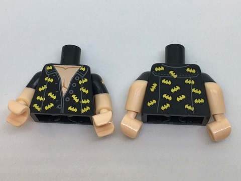 Torso Batman Open Shirt with Dark Bluish Gray Buttons, Trim and Yellow Bats Pattern / Light Nougat Arms with Black Short Sleeves / Light Nougat Hands