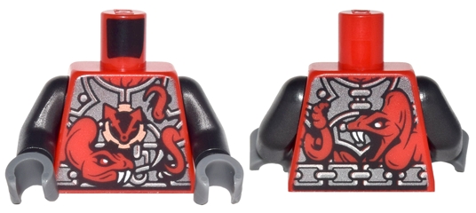 Torso Ninjago Metallic Silver Armor with 2 Large Red Snakes with White Fangs and Clock Pattern / Pearl Dark Gray Arms / Dark Bluish Gray Hands