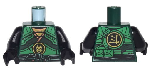 Torso Ninjago Armor with Green Straps and Black Sash with Golden Dragon Emblem Pattern / Black Arms / Black Hands