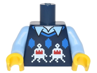 Torso Knit Vest with White and Red Creatures over Bright Light Blue Shirt with Collar Pattern / Bright Light Blue Arms / Yellow Hands