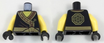 Torso Robe with Dark Brown Hem, Gold Trim and Ninjago Logogram 'EARTH', Dark Brown Creases, Waist Sash with Knot, Yellow Neck, Octagon and Circle Medallion Logo on Back Pattern / Yellow Arms / Black Hands
