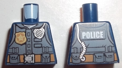 Torso Dark Bluish Gray Body Armor Vest with Strap over White Shirt, Medium Nougat Belt with Pouches and Silver Buckle, Gold Star Badge, Radio with Cord, Thin Font 'POLICE' on Back Pattern
