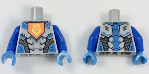Torso Nexo Knights Armor with Orange Emblem with Yellow Crowned Lion, Silver Panels Pattern / Blue Arms / Dark Azure Hands