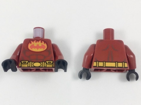 Torso Batman Red Bat in Bright Light Orange Oval with Flames, Gray Muscle Lines Pattern / Dark Red Arms / Black Hands