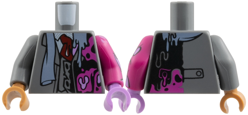 Torso Suit Jacket, Red Tie, Black and Magenta Left Side Pattern / Magenta Arm Left with Splotches and Tears Pattern / Dark Bluish Gray Arm Right / Medium Lavender Hand Left / Medium Nougat Hand Right