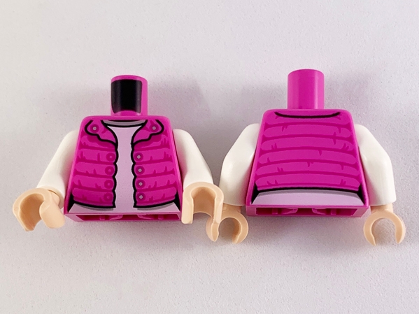 Torso Female Puffy Coat Open with Magenta Gathers and Silver Buttons over White Shirt with Light Bluish Gray Collar Pattern / White Arms / Light Nougat Hands