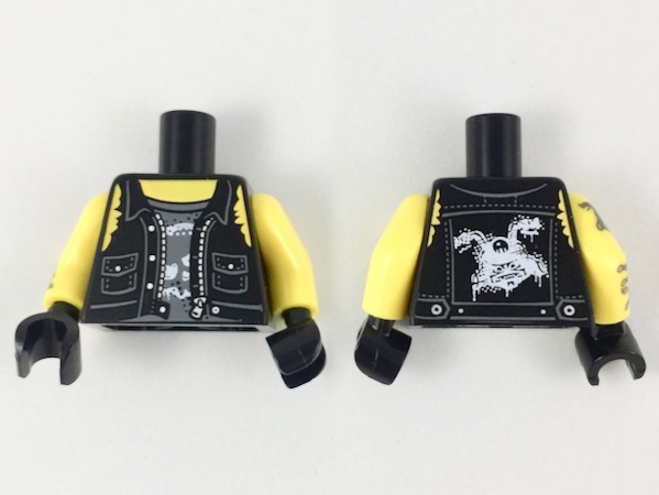 Torso Tattered Vest Open with Pockets, Zipper, Buttons, and White Sons of Garmadon (SOG) Logo on Back over Dark Bluish Gray Tank Top with Skull, Yellow Neck and Shoulders Pattern / Yellow Arm Left / Yellow Arm Right with Dark Bluish Gray Sons of Garmadon (SOG) Tattoo and Chains Pattern / Black Hands