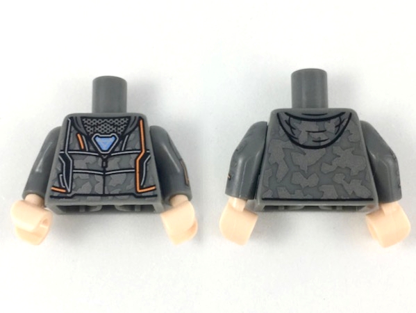 Torso Hoodie with Dark Silver Camouflage and Orange Trim, Triangle Arc Reactor Pattern / Dark Bluish Gray Arms with Dark Silver Camouflage and Orange Trim Pattern / Light Nougat Hands
