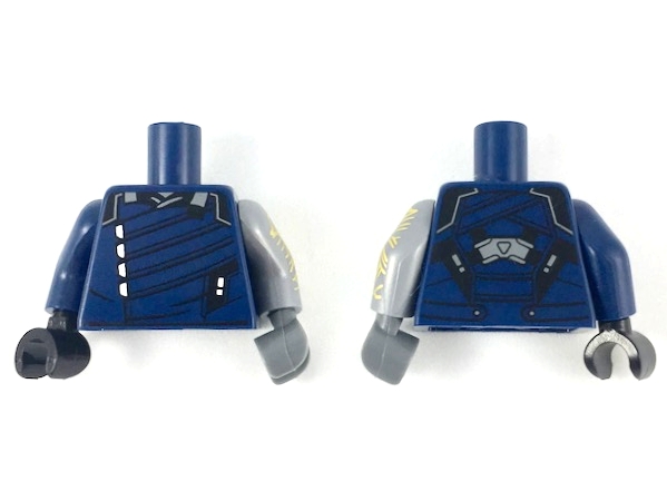 Torso Jacket with Silver Trim Pattern / Flat Silver Arm Left with Gold Circuitry Pattern / Dark Blue Arm Right / Dark Bluish Gray Hand Left / Black Hand Right