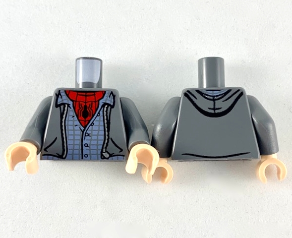 Torso Jacket with Hood, Silver Zipper, Sand Blue Shirt, Red Undershirt with Black Spider and Webs Pattern / Dark Bluish Gray Arms / Light Nougat Hands