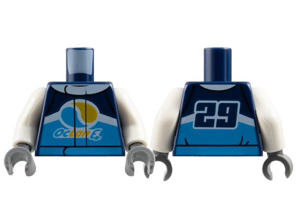 Torso Jacket with Dark Azure Belt, White Collar and Stripe, 'Octan E' Logo on Front, '29' on Back Pattern / White Arms / Dark Bluish Gray Hands