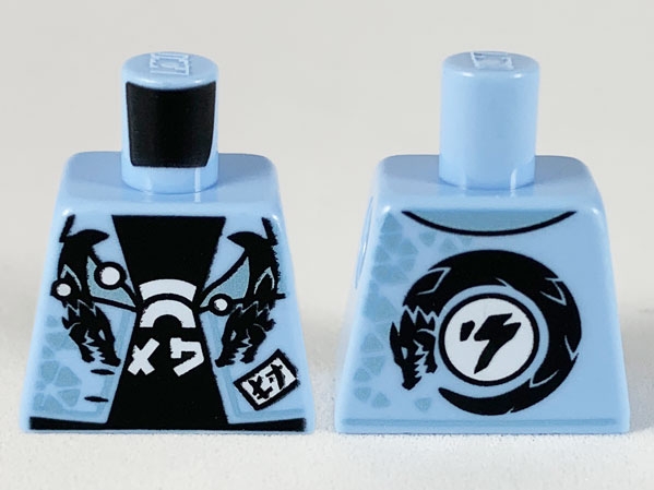 Torso Jacket with Black Dragons and Metallic Light Blue Triangles, Black Shirt with White Asian Symbols Pattern