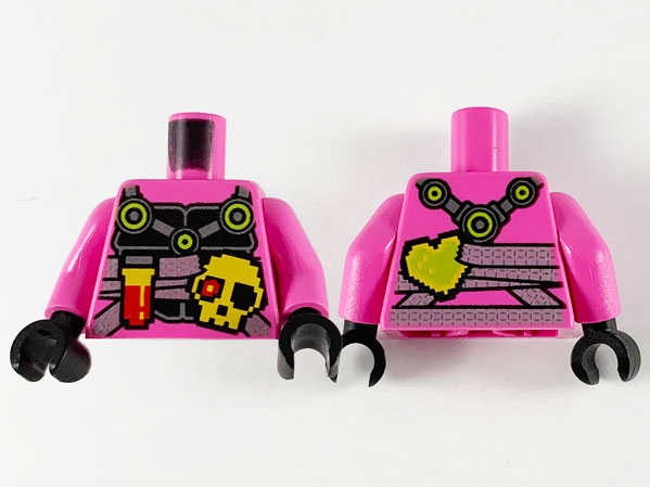 Torso Ninjago Black Breastplate with Silver Straps, Pixelated Flask, Skull, and Heart Pattern / Dark Pink Arms / Black Hands
