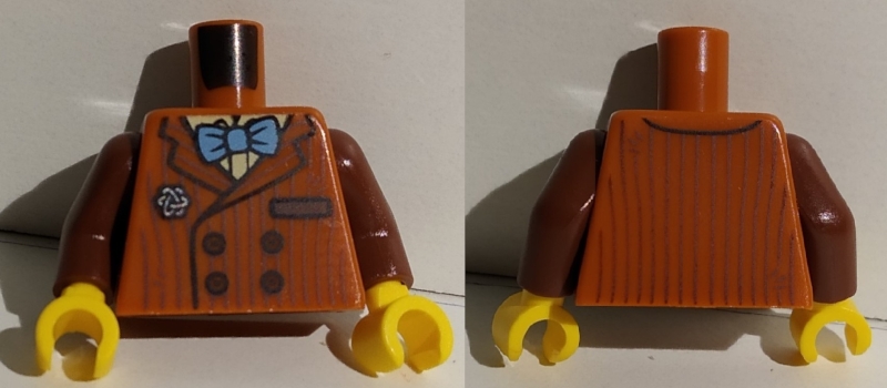 Torso Suit with Buttons, Pocket, Bright Light Yellow Shirt, Medium Blue Bow Tie, Silver Brooch Pattern / Reddish Brown Arms / Yellow Hands