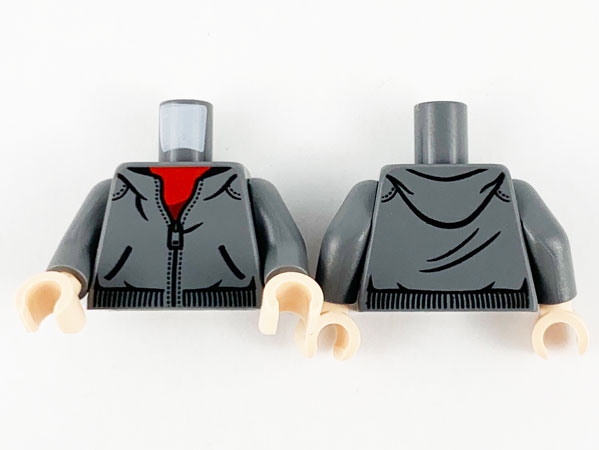 Torso Dark Bluish Gray Hoodie, Red Shirt and Zipper Pattern / Dark Bluish Gray Arms / Light Nougat Hands